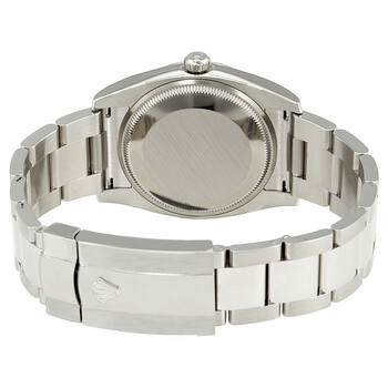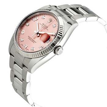 Stainless steel case with a stainless steel Rolex oyster bracelet. Fixed fluted 18kt white gold bezel. Pink dial with silver-tone hands and alternating Arabic numeral and diamond hour markers. Minute markers around the outer rim. Dial Type: Analog. Date display at the 3 o'clock position. Rolex calibre 3135 automatic movement with a 48-hour power reserve. Scratch resistant sapphire crystal. Screw down crown. Solid case back. Case size: 34 mm. Round case shape. Oysterlock clasp. Water resistant at 100 meters / 330 feet. Functions: date, hour, minute, second. Luxury watch style. Watch label: Swiss Made. Rolex Oyster Perpetual Date 34 Pink Dial Stainless Steel Rolex Oyster Automatic Men's Watch 115234PADO.