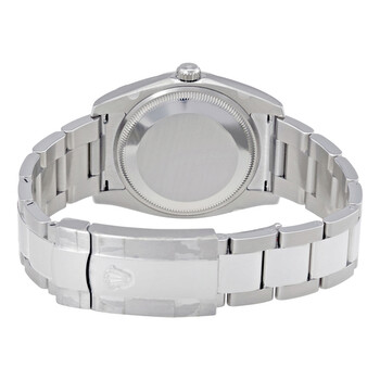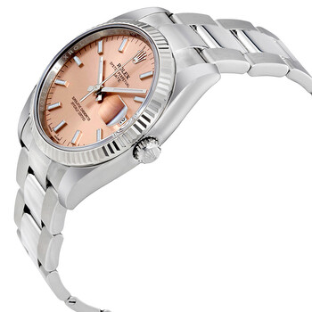 Stainless steel case with a stainless steel Rolex oyster bracelet. Fixed fluted 18kt white gold bezel. Pink dial with luminous silver-tone hands and stick hour markers. Minute markers around the outer rim. Dial Type: Analog. Luminescent hands and markers. Date display at the 3 o'clock position. Rolex calibre 3135 automatic movement with a 48-hour power reserve. Scratch resistant sapphire crystal. Screw down crown. Solid case back. Case size: 34 mm. Round case shape. Oysterlock clasp. Water resistant at 100 meters / 330 feet. Functions: date, hour, minute, second. Luxury watch style. Watch label: Swiss Made. Rolex Oyster Perpetual Date 34 Pink Dial Stainless Steel Rolex Oyster Automatic Men's Watch 115234PSO.