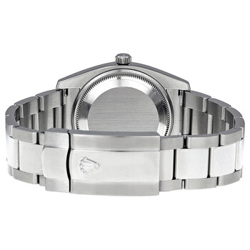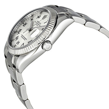 Stainless steel case with a stainless steel rolex oyster bracelet. Fixed - fluted 18k white gold bezel. Silver dial with silver-tone hands and Roman numeral hour markers. Dial Type: Analog. Date display at the 3 o'clock position. Automatic movement. Scratch resistant sapphire crystal. Case diameter: 34 mm. Round case shape. Water resistant at 100 meters / 330 feet. Functions: date, hour, minute, second. Luxury watch style. Watch label: Swiss Made. Rolex Oyster Perpetual Date 34 Silver Dial Stainless Steel Rolex Oyster Automatic Men's Watch 115234SRO.