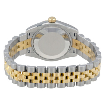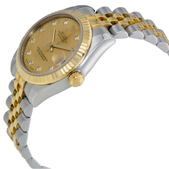 Stainless steel case with a stainless steel Rolex Jubilee bracelet with 18kt yellow gold center links. Fluted 18kt yellow gold bezel. Gold dust dial with gold-tone hands and diamonds hour markers. Dial Type: Analog. Date display at the 3 o'clock position. Rolex calibre 2235 automatic movement with a 48-hour power reserve. Scratch resistant sapphire crystal. Screw down crown. Solid case back. Case size: 31 mm. Round case shape. Concealed crown clasp. Water resistant at 100 meters / 330 feet. Functions: date, hour, minute, second. Luxury watch style. Watch label: Swiss Made. Rolex Oyster Perpetual Datejust 18 Carat Yellow Gold Jubilee Automatic Ladies Watch 178273GDDJ.
