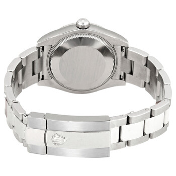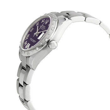 Stainless steel case with a stainless steel Rolex oyster bracelet. Fixed domed 18kt white gold bezel set with diamonds. Purple dial with silver-tone hands and Roman numeral hour markers. Diamond-set Roman numeral appears at the 6 o'clock position. Dial Type: Analog. Date display at the 3 o'clock position. Rolex calibre 2235 automatic movement, containing 31 Jewels, bitting at 28800 vph, and has a power reserve of approximately 48 hours. Scratch resistant sapphire crystal. Screw down crown. Solid case back. Round case shape. Case size: 31 mm. Oysterlock clasp. Water resistant at 100 meters / 330 feet. Functions: date, hour, minute, second, chronometer. Oyster Perpetual Datejust 31 Series. Luxury watch style. Watch label: Swiss Made. Rolex Oyster Perpetual Datejust 31 Automatic Chronometer Diamond Black Dial Ladies Watch 178344PURDO.