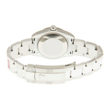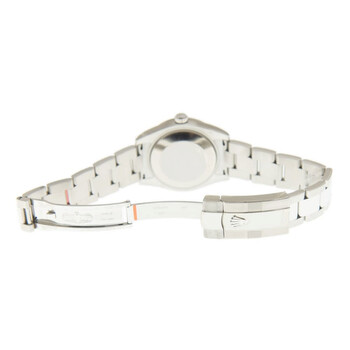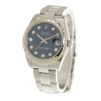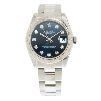 Stainless steel case with a silver-tone stainless steel rolex oyster bracelet. Fixed domed bezel with diamond set. Blue dial with diamonds hour markers. Dial Type: Analog. Date display at the 3 o'clock position. Rolex Calibre 2235 Automatic movement, containing 31 Jewels, bitting at 28800 vph, and has a power reserve of approximately 48 hours. Scratch resistant sapphire crystal. Screw down crown. Solid case back. Round case shape, case size: 31 mm. Oysterlock clasp. Water resistant at 100 meters / 330 feet. Functions: date, hour, minute, second, chronometer. Oyster Perpetual Datejust 31 Series. Casual watch style. Watch label: Swiss Made. Rolex Oyster Perpetual Datejust 31 Automatic Chronometer Diamond Blue Dial Ladies Watch 178344BLDO.