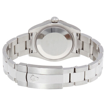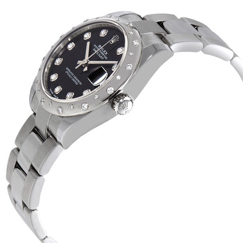 Stainless steel case with a stainless steel rolex oyster bracelet. Fixed - domed 18k white gold diamond-set bezel. Black dial with silver-tone hands and diamonds hour markers. Dial Type: Analog. Date display at the 3 o'clock position. Automatic movement. Scratch resistant sapphire crystal. Screw down crown. Case diameter: 31 mm. Round case shape. Oysterclasp clasp. Water resistant at 100 meters / 330 feet. Functions: date, hour, minute, second. Casual watch style. Watch label: Swiss Made. Rolex Oyster Perpetual Datejust 31 Black Dial Stainless Steel Rolex Oyster Automatic Ladies Watch 178344BKDO.