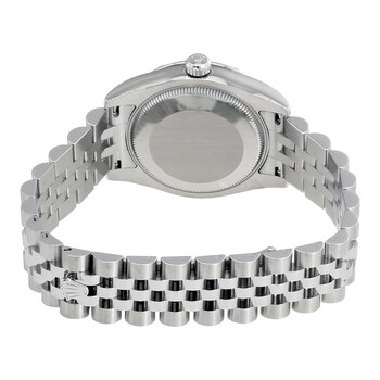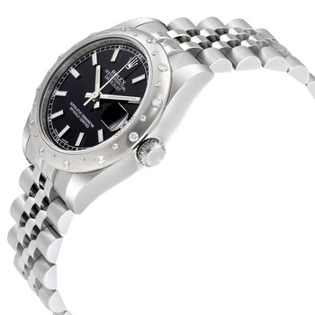 Stainless steel case with a stainless steel Rolex jubilee bracelet. Fixed domed 18kt white gold diamond-set bezel. Black dial with luminous silver-tone hands and index hour markers. Minute markers around the outer rim. Dial Type: Analog. Date display at the 3 o'clock position. Automatic movement with a 48-hour power reserve. Scratch resistant sapphire crystal. Screw down crown. Solid case back. Case diameter: 31 mm. Round case shape. Concealed crown clasp. Water resistant at 100 meters / 330 feet. Functions: date, hour, minute, second. Luxury watch style. Watch label: Swiss Made. Rolex Oyster Perpetual Datejust 31 Black Dial Stainless Steel Rolex Jubilee Automatic Ladies Watch 178344BKSJ.