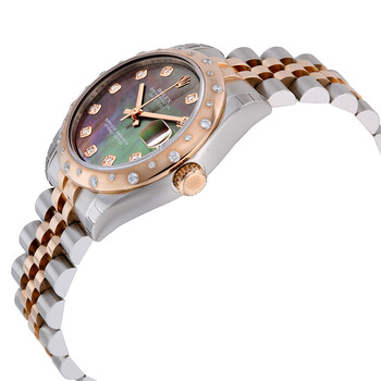 Stainless steel and 18k everose gold case with a stainless steel and 18k everose gold rolex jubilee bracelet. Fixed - domed 18k everose gold diamond-set bezel. Black mother of pearl dial with rose gold-tone hands and diamond hour markers. Dial Type: Analog. Date display at the 3 o'clock position. Automatic movement. Scratch resistant sapphire crystal. Screw down crown. Solid case back. Case diameter: 31 mm. Round case shape. Concealed crown clasp. Water resistant at 100 meters / 330 feet. Functions: date, hour, minute, second. Luxury watch style. Watch label: Swiss Made. Rolex Oyster Perpetual Datejust 31 Black Mother of Pearl Dial Stainless Steel and 18K Everose Gold Rolex Jubilee Automatic Ladies Watch 178341BKMDJ.