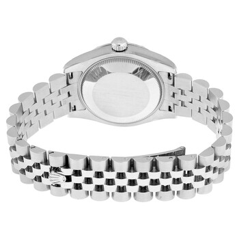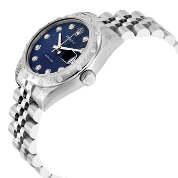 Stainless steel case with a stainless steel rolex jubilee bracelet. Fixed - domed 18k white gold diamond-set bezel. Blue jubilee dial with silver-tone hands and diamond hour markers. Dial Type: Analog. Date display at the 3 o'clock position. Automatic movement. Scratch resistant sapphire crystal. Screw down crown. Solid case back. Case diameter: 31 mm. Round case shape. Concealed crown clasp. Water resistant at 100 meters / 330 feet. Functions: date, hour, minute, second. Luxury watch style. Watch label: Swiss Made. Rolex Oyster Perpetual Datejust 31 Blue Jubilee Dial Stainless Steel Rolex Jubilee Automatic Ladies Watch 178344BLJDJ.