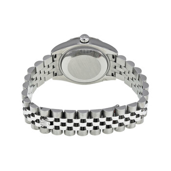 Stainless steel case with a stainless steel rolex jubilee bracelet. Fixed - domed 18k white gold diamond-set bezel. Blue dial with silver-tone hands and Roman numeral hour markers. Diamond-set roman numberal marks the 6 o'clock position. Dial Type: Analog. Date display at the 3 o'clock position. Automatic movement. Scratch resistant sapphire crystal. Screw down crown. Solid case back. Case diameter: 31 mm. Round case shape. Concealed crown clasp. Water resistant at 100 meters / 330 feet. Functions: date, hour, minute, second. Luxury watch style. Watch label: Swiss Made. Rolex Oyster Perpetual Datejust 31 Blue Dial Stainless Steel Rolex Jubilee Automatic Ladies Watch 178344BLRDJ.