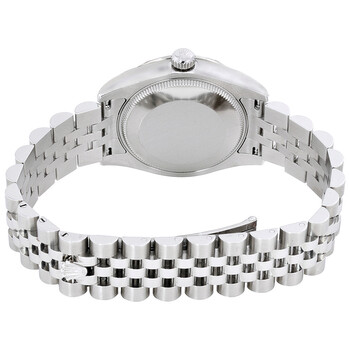 Stainless steel case with a stainless steel Rolex jubilee bracelet. Fixed domed 18kt white gold diamond-set bezel. Floral rhodium dial with silver-tone hands. Dial Type: Analog. Date display at the 3 o'clock position. Automatic movement with a 48-hour power reserve. Scratch resistant sapphire crystal. Screw down crown. Solid case back. Case diameter: 31 mm. Round case shape. Concealed crown clasp. Water resistant at 100 meters / 330 feet. Functions: date, hour, minute, second. Luxury watch style. Watch label: Swiss Made. Rolex Oyster Perpetual Datejust 31 Floral Rhodium Dial Stainless Steel Rolex Jubilee Automatic Ladies Watch 178344RFJ.