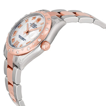 Stainless steel and 18k everose gold case with a stainless steel and 18k everose gold rolex oyster bracelet. Fixed - domed 18k everose gold diamond-set bezel. Mother of pearl dial with rose gold-tone hands and Roman numeral hour markers. Diamond roman numeral marks the 6 o'clock position. Dial Type: Analog. Date display at the 3 o'clock position. Automatic movement. Rolex caliber 2235 engine with about 48 hours power reserve. Scratch resistant sapphire crystal. Screw down crown. Case diameter: 31 mm. Round case shape. Band width: 20 mm. Oysterlock clasp. Water resistant at 100 meters / 330 feet. Functions: date, hour, minute, second. Luxury watch style. Watch label: Swiss Made. Rolex Oyster Perpetual Datejust 31 Mother of Pearl Dial Stainless Steel and 18K Everose Gold Rolex Oyster Automatic Ladies Watch 178341MRDO.