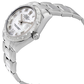 Stainless steel case with a stainless steel Rolex oyster bracelet. Fixed domed 18kt white gold diamond-set bezel. Mother of pearl dial with silver-tone hands and Roman numeral hour markers. Diamond-set Roman numeral marks the 6 o'clock position. Dial Type: Analog. Date display at the 3 o'clock position. Automatic movement with a 48-hour power reserve. Scratch resistant sapphire crystal. Screw down crown. Case diameter: 31 mm. Round case shape. Oysterclasp clasp. Water resistant at 100 meters / 330 feet. Functions: date, hour, minute, second. Luxury watch style. Watch label: Swiss Made. Rolex Oyster Perpetual Datejust 31 Mother of pearl Dial Stainless Steel Rolex Oyster Automatic Ladies Watch 178344MRDO.
