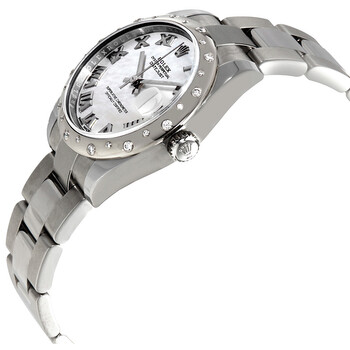 Stainless steel case with a stainless steel Rolex oyster bracelet. Fixed domed 18kt white gold bezel set with diamonds. Mother of pearl dial with silver-tone hands and Roman numeral hour markers. Dial Type: Analog. Date display at the 3 o'clock position. Rolex calibre 2235 automatic movement with a 48-hour power reserve. Scratch resistant sapphire crystal. Screw down crown. Solid case back. Round case shape. Case size: 31 mm. Oysterlock clasp. Water resistant at 100 meters / 330 feet. Functions: date, hour, minute, second, chronometer. Luxury watch style. Watch label: Swiss Made. Rolex Oyster Perpetual Datejust 31 Mother of Pearl Dial Stainless Steel Bracelet Automatic Ladies Watch 178344MRO.
