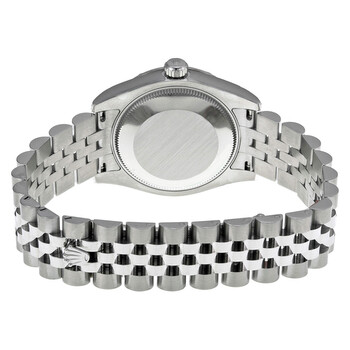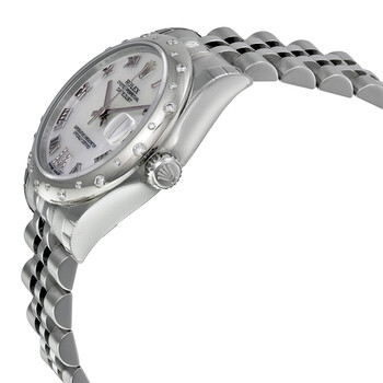 Stainless steel case with a stainless steel rolex jubilee bracelet. Fixed - domed 18k white gold diamond-set bezel. Mother of pearl dial with silver-tone hands and Roman numeral hour markers. Diamond-set roman numberal marks the 6 o'clock position. Dial Type: Analog. Date display at the 3 o'clock position. Automatic movement. Scratch resistant sapphire crystal. Screw down crown. Solid case back. Case diameter: 31 mm. Round case shape. Concealed crown clasp. Water resistant at 100 meters / 330 feet. Functions: date, hour, minute, second. Luxury watch style. Watch label: Swiss Made. Rolex Oyster Perpetual Datejust 31 Mother of Pearl Dial Stainless Steel Rolex Jubilee Automatic Ladies Watch 178344MRDJ.