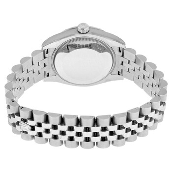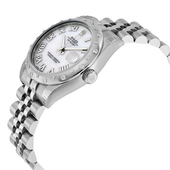 Stainless steel case with a stainless steel rolex jubilee bracelet. Fixed - domed 18k white gold diamond-set bezel. Mother of pearl dial with silver-tone hands and Roman numeral hour markers. Dial Type: Analog. Date display at the 3 o'clock position. Automatic movement. Scratch resistant sapphire crystal. Screw down crown. Solid case back. Case diameter: 31 mm. Round case shape. Concealed crown clasp. Water resistant at 100 meters / 330 feet. Functions: date, hour, minute, second. Luxury watch style. Watch label: Swiss Made. Rolex Oyster Perpetual Datejust 31 Mother of Pearl Dial Stainless Steel Rolex Jubilee Automatic Ladies Watch 178344PMRJ.