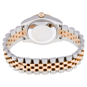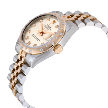 Stainless steel and 18k everose gold case with a stainless steel and 18k everose gold rolex jubilee bracelet. Fixed - domed 18k everose gold diamond-set bezel. Silver dial with rose gold-tone hands and diamond hour markers. Dial Type: Analog. Date display at the 3 o'clock position. Automatic movement. Scratch resistant sapphire crystal. Screw down crown. Solid case back. Case diameter: 31 mm. Round case shape. Concealed crown clasp. Water resistant at 100 meters / 330 feet. Functions: date, hour, minute, second. Luxury watch style. Watch label: Swiss Made. Rolex Oyster Perpetual Datejust 31 Silver Dial Stainless Steel and 18K Everose Gold Rolex Jubilee Automatic Ladies Watch 178341SDJ.