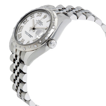 Stainless steel case with a stainless steel Rolex jubilee bracelet. Fixed domed 18kt white gold diamond-set bezel. White dial with silver-tone hands and Roman numeral hour markers. Dial Type: Analog. Date display at the 3 o'clock position. Rolex calibre 2235 automatic movement with a 48-hour power reserve. Scratch resistant sapphire crystal. Screw down crown. Solid case back. Case size: 31 mm. Round case shape. Concealed crown clasp. Water resistant at 100 meters / 330 feet. Functions: date, hour, minute, second. Luxury watch style. Watch label: Swiss Made. Rolex Oyster Perpetual Datejust 31 White Dial Stainless Steel Rolex Jubilee Automatic Ladies Watch 178344WRJ.