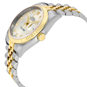 Stainless steel case with a stainless steel Rolex jubilee bracelet with 18kt yellow gold center links. Fixed fluted 18kt yellow gold bezel. Silver dial with yellow gold hands and diamond hour markers. Dial Type: Analog. Date display at the 3 o'clock position. Automatic movement with a 50-hour power reserve. Scratch resistant sapphire crystal. Screw down crown. Solid case back. Case size: 36 mm. Round case shape. Hidden deployment clasp. Water resistant at 100 meters / 330 feet. Functions: date, hour, minute, second. Luxury watch style. Watch label: Swiss Made. Item Variations: 116233, 116233-SDJ, Rolex-116233, Rolex-116233-SDJ. Rolex Oyster Perpetual Datejust 36 Automatic Silver Dial Stainless Steel and 18kt Yellow Gold Rolex Jubilee Men's Watch 116233SDJ.