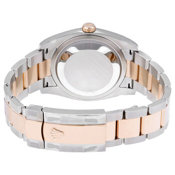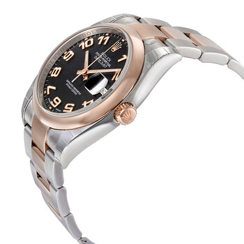 Stainless steel case with a stainless steel Rolex oyster bracelet with 18kt everose gold center links. Fixed domed 18kt everose gold bezel. Black concentric dial with rose gold-tone hands and Arabic numeral hour markers. Minute markers around the outer rim. Dial Type: Analog. Date display at the 3 o'clock position. Rolex calibre 3135 automatic movement with a 50-hour power reserve. Scratch resistant sapphire crystal. Screw down crown. Solid case back. Case size: 36 mm. Round case shape. Oysterlock clasp. Water resistant at 100 meters / 330 feet. Functions: date, hour, minute, second. Luxury watch style. Watch label: Swiss Made. Rolex Oyster Perpetual Datejust 36 Black Concentric Dial Stainless Steel and 18K Everose Gold Rolex Oyster Automatic Men's Watch 116201BKCAO.