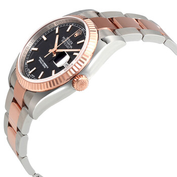 Stainless steel case with a stainless steel Rolex oyster bracelet with 18kt everose gold center links. Fixed fluted 18kt everose gold bezel. Black dial with rose gold-tone hands and index / Roman numeral hour markers. Minute markers around the outer rim. Dial Type: Analog. Date display at the 3 o'clock position. Rolex calibre 3135 automatic movement with a 50-hour power reserve. Scratch resistant sapphire crystal. Screw down crown. Solid case back. Case size: 36 mm. Round case shape. Oysterlock clasp. Water resistant at 100 meters / 330 feet. Functions: date, hour, minute, second, chronometer. Luxury watch style. Watch label: Swiss Made. Rolex Oyster Perpetual Datejust 36 Black Dial Stainless Steel and 18K Everose Gold Rolex Oyster Automatic Men's Watch 116231BKSO.