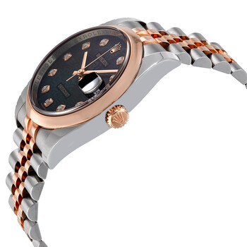 Stainless steel case with a stainless steel Rolex jubilee bracelet with 18kt everose gold center links. Fixed domed 18kt everose gold bezel. Black jubilee dial with rose gold-tone hands and diamond hour markers. Dial Type: Analog. Date display at the 3 o'clock position. Rolex calibre 3135 automatic movement with a 50-hour power reserve. Scratch resistant sapphire crystal. Screw down crown. Solid case back. Round case shape. Case size: 36 mm. Concealed crown clasp. Water resistant at 100 meters / 330 feet. Functions: date, hour, minute, second, chronometer. Casual watch style. Watch label: Swiss Made. Rolex Oyster Perpetual Datejust 36 Black Dial Stainless Steel and 18K Everose Gold Jubilee Bracelet Automatic Men's Watch 116201BKJDJ.
