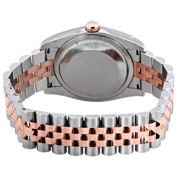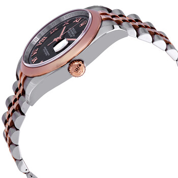 Stainless steel case with a stainless steel Rolex jubilee bracelet with 18kt everose gold center links. Fixed domed 18kt everose gold bezel. Black dial with rose gold-tone hands and Roman numeral hour markers. Minute markers around the outer rim. Dial Type: Analog. Date display at the 3 o'clock position. Automatic movement with a 50-hour power reserve. Scratch resistant sapphire crystal. Screw down crown. Solid case back. Case diameter: 36 mm. Round case shape. Concealed crown clasp. Water resistant at 100 meters / 330 feet. Functions: date, hour, minute, second. Casual watch style. Watch label: Swiss Made. Rolex Oyster Perpetual Datejust 36 Black Dial Stainless Steel and 18K Everose Gold Rolex Jubilee Automatic Men's Watch 116201BKRJ.