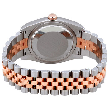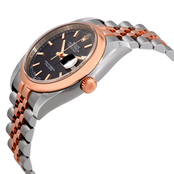 Stainless steel case with a stainless steel Rolex jubilee bracelet with 18kt everose gold center links. Fixed domed 18kt everose gold bezel. Black dial with luminous rose gold-tone hands and index / Roman numeral hour markers. Minute markers around the outer rim. Dial Type: Analog. Luminescent hands and markers. Date display at the 3 o'clock position. Rolex calibre 3135 automatic movement with a 50-hour power reserve. Scratch resistant sapphire crystal. Screw down crown. Solid case back. Round case shape. Case size: 36 mm. Concealed crown clasp. Water resistant at 100 meters / 330 feet. Functions: date, hour, minute, second, chronometer. Casual watch style. Watch label: Swiss Made. Rolex Oyster Perpetual Datejust 36 Black Dial Stainless Steel and 18K Everose Gold Jubilee Bracelet Automatic Men's Watch 116201BKSJ.