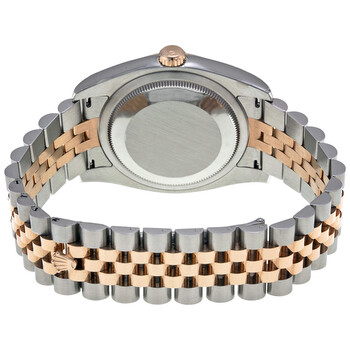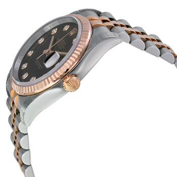 Stainless steel and 18k everose gold case with a stainless steel and 18k everose gold rolex jubilee bracelet. Fixed - fluted 18k everose gold bezel. Black dial with rose gold-tone hands and diamond hour markers. Dial Type: Analog. Date display at the 3 o'clock position. Automatic movement. Scratch resistant sapphire crystal. Solid case back. Case diameter: 36 mm. Round case shape. Fold over clasp. Water resistant at 100 meters / 330 feet. Functions: date, hour, minute, second. Luxury watch style. Watch label: Swiss Made. Rolex Oyster Perpetual Datejust 36 Black Dial Stainless Steel and 18K Everose Gold Rolex Jubilee Automatic Men's Watch 116231BKDJ.