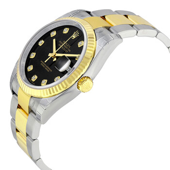Stainless steel and 18k yellow gold case with a stainless steel and 18k yellow gold rolex oyster bracelet. Fixed - fluted 18k yellow gold bezel. Black dial with yellow gold-tone hands and diamond hour markers. Dial Type: Analog. Date display at the 3 o'clock position. Automatic movement. Scratch resistant sapphire crystal. Screw down crown. Case diameter: 36 mm. Round case shape. Oysterclasp clasp. Water resistant at 100 meters / 330 feet. Functions: date, hour, minute, second. Luxury watch style. Watch label: Swiss Made. Rolex Oyster Perpetual Datejust 36 Black Dial Stainless Steel and 18K Yellow Gold Rolex Oyster Automatic Men's Watch 116233BKDO.