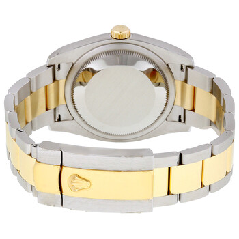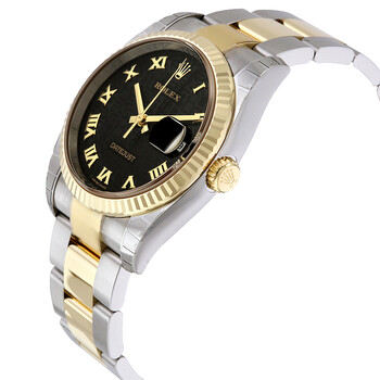 Stainless steel case with a stainless steel Roles oyster bracelet with 18kt yellow gold center links. Fixed fluted 18kt yellow gold bezel. Black jubilee dial with yellow gold-tone hands and Roman numeral hour markers. Dial Type: Analog. Date display at the 3 o'clock position. Rolex Calibre 3135 automatic movement with a 50-hour power reserve. Scratch resistant sapphire crystal. Screw down crown. Solid case back. Case size: 36 mm. Round case shape. Oysterlock clasp. Water resistant at 100 meters / 330 feet. Functions: date, hour, minute, second. Luxury watch style. Watch label: Swiss Made. Rolex Oyster Perpetual Datejust 36 Black Jubilee Dial Stainless Steel and 18K Yellow Gold Rolex Oyster Automatic Men's Watch 116233BKJRO.