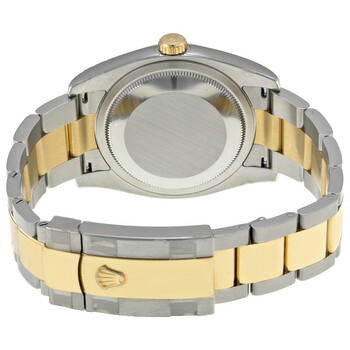 Stainless steel case with a stainless steel Rolex oyster bracelet with 18kt yellow gold center links. Fixed fluted 18kt yellow gold bezel. Black dial with luminous yellow gold-tone hands and index hour markers. Minute markers around the outer rim. Dial Type: Analog. Luminescent hands and markers. Date display at the 3 o'clock position. Rolex calibre 3135 automatic movement with a 50-hour power reserve. Scratch resistant sapphire crystal. Screw down crown. Solid case back. Case size: 36 mm. Round case shape. Oysterlock clasp. Water resistant at 100 meters / 330 feet. Functions: date, hour, minute, second, chronometer. Luxury watch style. Watch label: Swiss Made. Rolex Oyster Perpetual Datejust 36 Black Dial Stainless Steel and 18K Yellow Gold Bracelet Automatic Men's Watch 116233BKSO.