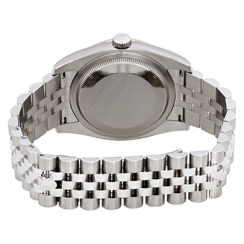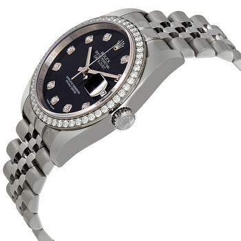 Stainless steel case with a stainless steel Rolex jubilee bracelet. Fixed 18kt white gold diamond-set bezel. Black dial with silver-tone hands and diamond hour markers. Dial Type: Analog. Date display at the 3 o'clock position. Rolex calibre 3135 automatic movement with a 50-hour power reserve. Scratch resistant sapphire crystal. Screw down crown. Solid case back. Case size: 36 mm. Round case shape. Concealed crown clasp. Water resistant at 100 meters / 330 feet. Functions: date, hour, minute, second, chronometer. Luxury watch style. Watch label: Swiss Made. Rolex Oyster Perpetual Datejust 36 Black Dial Stainless Steel Rolex Jubilee Automatic Ladies Watch 116244BKDJ.