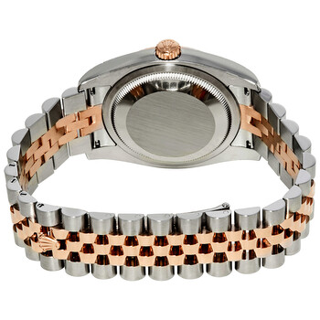 Stainless steel case with a stainless steel Rolex jubilee bracelet with 18kt everose gold center links. Fixed fluted 18kt everose gold bezel. Black mother of pearl dial with rose gold-tone hands and diamond hour markers. Dial Type: Analog. Date display at the 3 o'clock position. Rolex calibre 3135 automatic movement with a 50-hour power reserve. Scratch resistant sapphire crystal. Screw down crown. Solid case back. Round case shape. Case size: 36 mm. Concealed crown clasp. Water resistant at 100 meters / 330 feet. Functions: date, hour, minute, second, chronometer. Luxury watch style. Watch label: Swiss Made. Rolex Oyster Perpetual Datejust 36 Black Mother of Pearl Dial Stainless Steel and 18K Everose Gold Jubilee Bracelet Automatic Ladies Watch 116231BKMDJ.