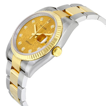 Stainless steel case with a stainless steel Rolex oyster bracelet with 18kt yellow gold center links. Fixed fluted 18kt yellow gold bezel. Champagne jubilee dial with yellow gold-tone hands and diamond hour markers. Dial Type: Analog. Date display at the 3 o'clock position. Rolex calibre 3135 automatic movement with a 50-hour power reserve. Scratch resistant sapphire crystal. Screw down crown. Solid case back. Case size: 36 mm. Round case shape. Oysterlock clasp. Water resistant at 100 meters / 330 feet. Functions: date, hour, minute, second. Luxury watch style. Watch label: Swiss Made. Rolex Oyster Perpetual Datejust 36 Champagne Jubilee Dial Stainless Steel and 18K Yellow Gold Rolex Oyster Automatic Men's Watch 116233CJDO.