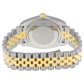 Stainless steel case with a stainless steel Rolex jubilee bracelet with 18kt yellow gold center links. Fixed fluted 18kt yellow gold bezel. Champagne dial with yellow gold-tone hands and diamond hour markers. Dial Type: Analog. Date display at the 3 o'clock position. Automatic movement with a 50-hour power reserve. Scratch resistant sapphire crystal. Screw down crown. Solid case back. Case size: 36 mm. Round case shape. Hidden deployment clasp. Water resistant at 100 meters / 330 feet. Functions: date, hour, minute, second. Luxury watch style. Watch label: Swiss Made. Item Variations: 116233, 116233-CDJ, Rolex-116233, Rolex-116233-CDJ. Rolex Oyster Perpetual Datejust 36 Champagne Dial Stainless Steel and 18K Yellow Gold Rolex Jubilee Automatic Men's Watch 116233CDJ.