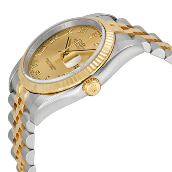 Stainless steel case with a stainless steel Rolex jubilee bracelet with 18kt yellow gold center links. Fixed fluted 18kt yellow gold bezel. Champagne dial with yellow gold-tone hands and Roman numeral hour markers. Minute markers around the outer rim. Dial Type: Analog. Date display at the 3 o'clock position. Rolex calibre 3135 automatic movement with a 50-hour power reserve. Scratch resistant sapphire crystal. Screw down crown. Solid case back. Case size: 36 mm. Round case shape. Hidden deployment clasp. Water resistant at 100 meters / 330 feet. Functions: date, hour, minute, second. Additional Info: date displays at 3 o'clock position. Luxury watch style. Watch label: Swiss Made. Item Variations: 116233CHRJ, Rolex-116233CHRJ 116233, 116233-CRJ, Rolex-116233, Rolex-116233-CRJ. Rolex Oyster Perpetual Datejust 36 Champagne Dial Stainless Steel and 18K Yellow Gold Rolex Jubilee Automatic Men's Watch 116233CRJ.