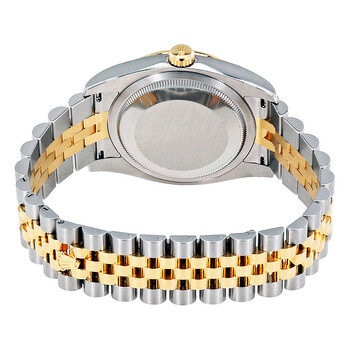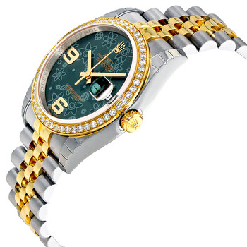 Stainless steel case with a stainless steel Rolex jubilee bracelet with 18kt yellow gold center links. Fixed 18kt yellow gold set with diamonds bezel. Green floral dial with yellow gold-tone hands. Arabic numerals mark the 6 and 9 o'clock positions. Dial Type: Analog. Date display at the 3 o'clock position. Rolex Calibre 3135 Automatic movement, containing 31 Jewels, bitting at 28800 vph, and has a power reserve of approximately 48 hours. Scratch resistant sapphire crystal. Screw down crown. Solid case back. Round case shape. Case size: 36 mm. Concealed crown clasp. Water resistant at 100 meters / 330 feet. Functions: date, hour, minute, second, chronometer. Oyster Perpetual Datejust 36 Series. Luxury watch style. Watch label: Swiss Made. Item Variations: 116243-63600. Rolex Oyster Perpetual Datejust 36 Green Floral Dial Stainless Steel and 18K Yellow Gold Jubilee Bracelet Automatic Ladies Watch 116243GRFAJ.