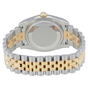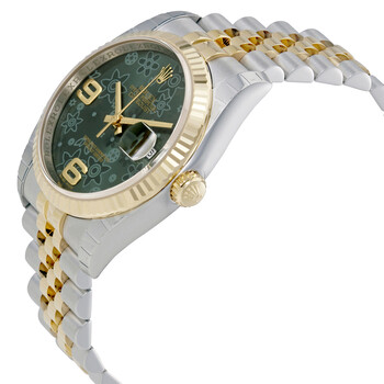 Stainless steel case with a stainless steel Rolex jubilee bracelet with 18kt yellow gold center links . Fixed fluted 18kt yellow gold bezel. Green floral dial with yellow gold-tone hands. Arabic numerals appear at the 6 and 9 o'clock positions. Dial Type: Analog. Date display at the 3 o'clock position. Rolex calibre 3135 automatic movement, containing 31 Jewels, bitting at 28800 vph, and has a power reserve of approximately 48 hours. Scratch resistant sapphire crystal. Screw down crown. Solid case back. Round case shape. Case size: 36 mm. Concealed crown clasp. Water resistant at 100 meters / 330 feet. Functions: date, hour, minute, second, chronometer. Oyster Perpetual Datejust 36 Series. Luxury watch style. Watch label: Swiss Made. Rolex Oyster Perpetual Datejust 36 Green Floral Dial Steel and 18K Yellow Gold Jubilee Unisex Watch 116233GNFAJ.