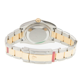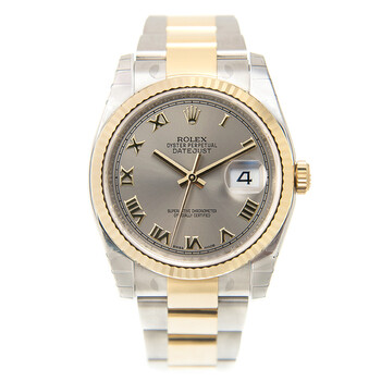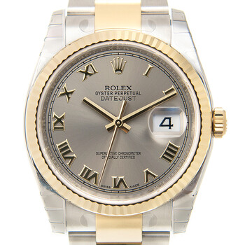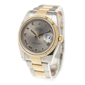Stainless steel and 18k yellow gold case with a stainless steel and 18k yellow gold rolex oyster bracelet. Fixed - fluted 18k yellow gold bezel. Grey dial with yellow gold-tone hands and Roman numeral hour markers. Dial Type: Analog. Date display at the 3 o'clock position. Automatic movement. Scratch resistant sapphire crystal. Screw down crown. Case diameter: 36 mm. Round case shape. Oysterclasp clasp. Water resistant at 100 meters / 330 feet. Functions: date, hour, minute, second. Luxury watch style. Watch label: Swiss Made. Rolex Oyster Perpetual Datejust 36 Grey Dial Stainless Steel and 18K Yellow Gold Rolex Oyster Automatic Men's Watch 116233GRO.