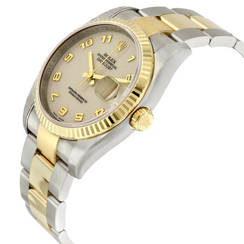 Stainless steel and 18k yellow gold case with a stainless steel and 18k yellow gold rolex oyster bracelet. Fixed - fluted 18k yellow gold bezel. Ivory jubilee dial with yellow gold-tone hands and Arabic hour markers. Dial Type: Analog. Date display at the 3 o'clock position. Automatic movement. Scratch resistant sapphire crystal. Screw down crown. Case diameter: 36 mm. Round case shape. Oysterclasp clasp. Water resistant at 100 meters / 330 feet. Functions: date, hour, minute, second. Luxury watch style. Watch label: Swiss Made. Rolex Oyster Perpetual Datejust 36 Ivory Jubilee Dial Stainless Steel and 18K Yellow Gold Rolex Oyster Automatic Men's Watch 116233IJAO.