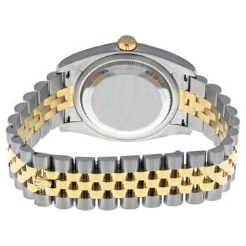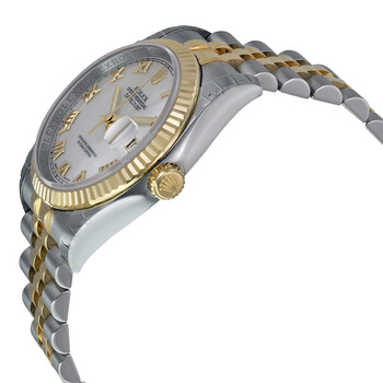 Stainless steel case with a stainless steel Rolex jubilee bracelet with 18kt yellow gold center links. Fixed fluted 18kt yellow gold bezel. Mother of pearl dial with yellow gold-tone hands and Roman numeral hour markers. Minute markers around the outer rim. Dial Type: Analog. Date display at the 3 o'clock position. Rolex calibre 3135 automatic movement with a 50-hour power reserve. Scratch resistant sapphire crystal. Screw down crown. Solid case back. Case size: 36 mm. Round case shape. Concealed crown clasp. Water resistant at 100 meters / 330 feet. Functions: date, hour, minute, second. Casual watch style. Watch label: Swiss Made. Rolex Oyster Perpetual Datejust 36 Mother of Pearl Dial Stainless Steel and 18K Yellow Gold Rolex Jubilee Automatic Men's Watch 116233MRJ.