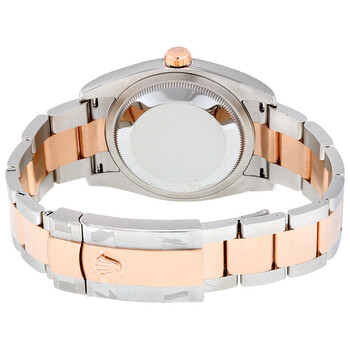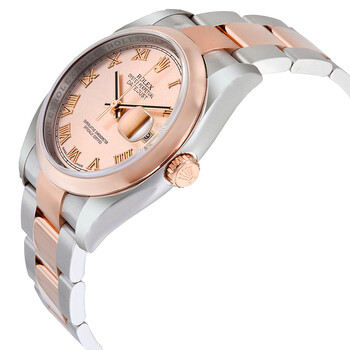 Stainless steel case with a stainless steel Rolex Oyster bracelet with 18kt everose gold center links. Fixed domed 18kt everose gold bezel. Pink dial with rose gold hands and Roman numeral hour markers. Minute markers around the outer rim. Dial Type: Analog. Date display at the 3 o'clock position. Rolex calibre 3135 automatic movement with a 50-hour power reserve. Scratch resistant sapphire crystal. Screw down crown. Solid case back. Case size: 36 mm. Round case shape. Oysterlock clasp. Water resistant at 100 meters / 330 feet. Functions: date, hour, minute, second. Luxury watch style. Watch label: Swiss Made. Rolex Oyster Perpetual Datejust 36 Pink Dial Stainless Steel and 18K Everose Gold Rolex Oyster Automatic Unisex Watch 116201PKRO.