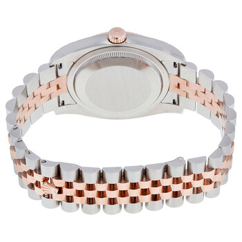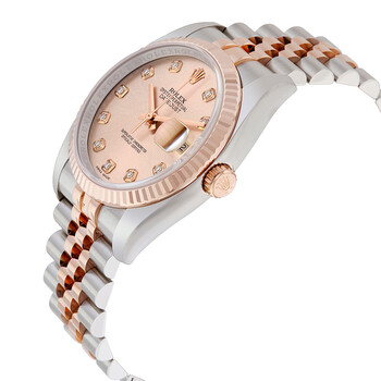 Stainless steel case with a stainless steel Rolex jubilee bracelet with 18kt everose gold center links. Fixed fluted 18kt everose gold bezel. Rose dial with pink gold-tone hands and diamond hour markers. Dial Type: Analog. Date display at the 3 o'clock position. Automatic movement with a 50-hour power reserve. Scratch resistant sapphire crystal. Screw down crown. Solid case back. Case size: 36 mm. Round case shape. Concealed crown clasp. Water resistant at 100 meters / 330 feet. Functions: date, hour, minute, second. Luxury watch style. Watch label: Swiss Made. Rolex Oyster Perpetual Datejust 36 Rose Dial Stainless Steel and 18K Everose Gold Rolex Jubilee Automatic Men's Watch 116231PDJ.