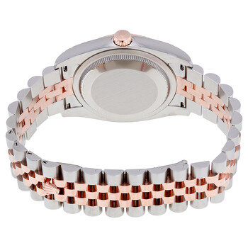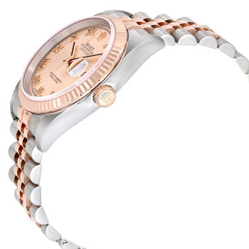 Stainless steel case with a stainless steel Rolex jubilee bracelet with 18kt everose gold center links. Fixed fluted 18kt everose gold bezel. Rose dial with everose gold-tone hands and Roman numeral hour markers. Minute markers around the outer rim. Dial Type: Analog. Date display at the 3 o'clock position. Rolex calibre 3135 automatic movement with a 50-hour power reserve. Scratch resistant sapphire crystal. Screw down crown. Solid case back. Case size: 36 mm. Round case shape. Concealed crown clasp. Water resistant at 100 meters / 330 feet. Functions: date, hour, minute, second. Luxury watch style. Watch label: Swiss Made. Rolex Oyster Perpetual Datejust 36 Rose Dial Stainless Steel and 18K Everose Gold Rolex Jubilee Automatic Men's Watch 116231PRJ.