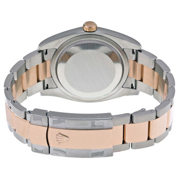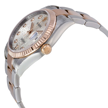 Stainless steel case with a stainless steel Rolex oyster bracelet with 18kt everose gold center links. Fixed fluted 18kt everose gold bezel. Silver dial with rose gold-tone hands and diamond hour markers. Dial Type: Analog. Date display at the 3 o'clock position. Rolex calibre 3135 automatic movement with a 50-hour power reserve. Scratch resistant sapphire crystal. Screw down crown. Solid case back. Round case shape. Case size: 36 mm. Oysterlock clasp. Water resistant at 100 meters / 330 feet. Functions: date, hour, minute, second, chronometer. Luxury watch style. Watch label: Swiss Made. Rolex Oyster Perpetual Datejust 36 Silver Dial Stainless Steel and 18K Everose Gold Bracelet Automatic Men's Watch 116231SJDO.