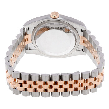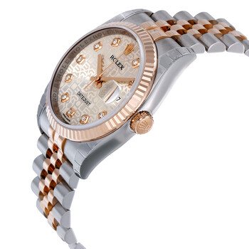 Stainless steel case with a stainless steel Rolex jubilee bracelet with 18kt everose gold center links. Fixed fluted 18kt everose gold bezel. Silver jubilee dial with rose gold-tone hands and diamond hour markers. Dial Type: Analog. Date display at the 3 o'clock position. Rolex calibre 3135 automatic movement with a 50-hour power reserve. Scratch resistant sapphire crystal. Screw down crown. Solid case back. Round case shape. Case size: 36 mm. Concealed crown clasp. Water resistant at 100 meters / 330 feet. Functions: date, hour, minute, second, chronometer. Luxury watch style. Watch label: Swiss Made. Rolex Oyster Perpetual Datejust 36 Silver Dial Stainless Steel and 18K Everose Gold Jubilee Bracelet Automatic Men's Watch 116231SJDJ.