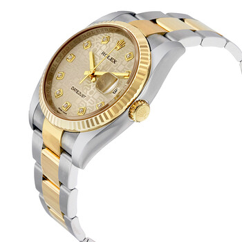 Stainless steel case with a stainless steel Rolex oyster bracelet with 18kt yellow gold center links. Fixed fluted 18kt yellow gold bezel. Silver jubilee dial with yellow gold hands and diamond hour markers. Dial Type: Analog. Date display at the 3 o'clock position. Rolex calibre 3135 automatic movement with a 50-hour power reserve. Scratch resistant sapphire crystal. Screw down crown. Solid case back. Case size: 36 mm. Round case shape. Oysterlock clasp. Water resistant at 100 meters / 330 feet. Functions: date, hour, minute, second. Luxury watch style. Watch label: Swiss Made. Rolex Oyster Perpetual Datejust 36 Silver Jubilee Dial Stainless Steel and 18K Yellow Gold Rolex Oyster Automatic Men's Watch 116233SJDO.