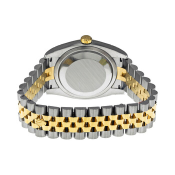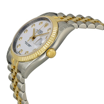 Stainless steel case with a stainless steel Rolex jubilee bracelet with 18kt yellow gold center links. Fixed fluted 18kt yellow gold bezel. White dial with yellow gold-tone hands and diamond hour markers. Dial Type: Analog. Date display at the 3 o'clock position. Rolex calibre 3135 automatic movement with a 50-hour power reserve. Scratch resistant sapphire crystal. Screw down crown. Solid case back. Case size: 36 mm. Round case shape. Hidden deployment clasp. Water resistant at 100 meters / 330 feet. Functions: date, hour, minute, second, chronometer. Additional Info: date displays at 3 o'clock position. Luxury watch style. Watch label: Swiss Made. Item Variations: 116233, 116233-WDJ, Rolex-116233, Rolex-116233-WDJ. Rolex Oyster Perpetual Datejust 36 White Dial Stainless Steel and 18K Yellow Gold Rolex Jubilee Automatic Men's Watch 116233WDJ.