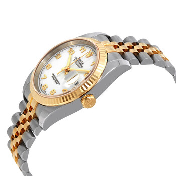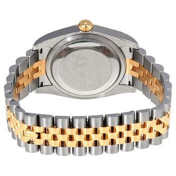 Stainless steel and 18k yellow gold case with a stainless steel and 18k yellow gold rolex jubilee bracelet. Fixed - fluted 18k yellow gold bezel. White dial with yellow gold-tone hands and Arabic hour markers. Minute markers around the outer rim. Dial Type: Analog. Date display at the 3 o'clock position. Automatic movement. Scratch resistant sapphire crystal. Screw down crown. Solid case back. Case diameter: 36 mm. Round case shape. Concealed crown clasp. Water resistant at 100 meters / 330 feet. Functions: date, hour, minute, second. Casual watch style. Watch label: Swiss Made. Rolex Oyster Perpetual Datejust 36 White Dial Stainless Steel and 18K Yellow Gold Rolex Jubilee Automatic Men's Watch 116233WAJ.