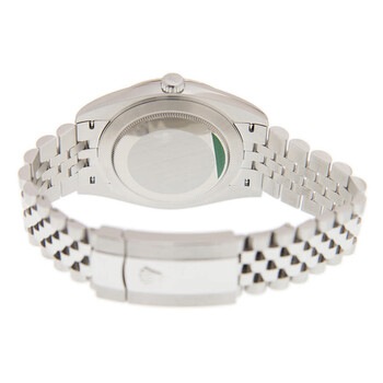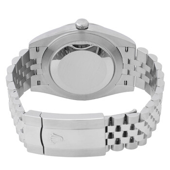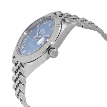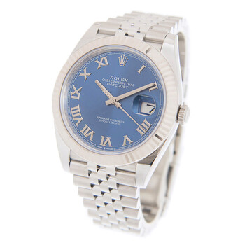 Stainless steel case with a stainless steel Rolex jubilee bracelet. Fixed fluted 18kt white gold bezel. Blue dial with white gold hands and Roman numeral hour markers. Minute markers around the outer rim. Dial Type: Analog. Luminescent hands and markers. Date display at the 3 o'clock position. Rolex calibre 3235 automatic movement, based upon Rolex 3035, containing 31 Jewels, bitting at 28800 vph, and has a power reserve of approximately 70 hours. Scratch resistant sapphire crystal. Screw down crown. Solid case back. Round case shape. Case size: 41 mm. Fold over oyster clasp. Water resistant at 100 meters / 330 feet. Functions: date, hour, minute, second. Oyster Perpetual Datejust Series. Luxury watch style. Watch label: Swiss Made. Rolex Oyster Perpetual Datejust Automatic Blue Dial Men's Watch 126334 BLRJ.