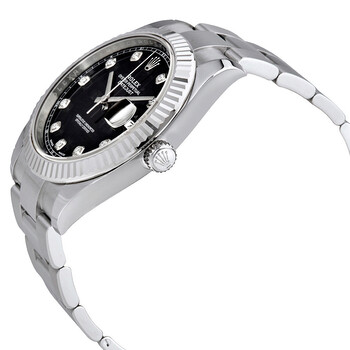 Stainless steel case with a stainless steel Rolex oyster bracelet. Fluted 18kt white gold bezel. Black dial with silver-tone hands and diamond / Roman numeral hour markers. Dial Type: Analog. Date display at the 3 o'clock position. Rolex calibre 3235 automatic movement with a 70-hour power reserve. Scratch resistant sapphire crystal. Screw down crown. Solid case back. Round case shape. Case size: 41 mm. Oysterlock clasp. Water resistant at 100 meters / 330 feet. Functions: date, hour, minute, second. Luxury watch style. Watch label: Swiss Made. Rolex Oyster Perpetual Datejust Black Diamond Dial Men's Watch 126334BKDO.