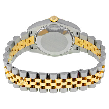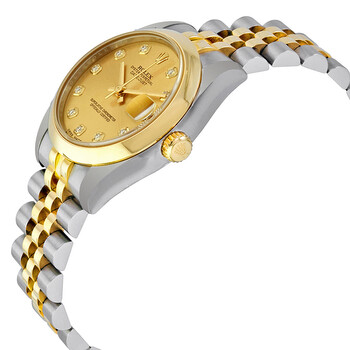 Stainless steel case with a stainless steel Rolex jubilee bracelet with 18kt yellow gold center links. Fixed domed 18kt yellow gold bezel. Champagne dial with yellow gold-tone hands and diamond hour markers. Dial Type: Analog. Date display at the 3 o'clock position. Rolex calibre 2235 automatic movement with a 48-hour power reserve. Scratch resistant sapphire crystal. Screw down crown. Solid case back. Case size: 31 mm. Round case shape. Concealed folding clasp. Water resistant at 100 meters / 330 feet. Functions: date, hour, minute, second. Luxury watch style. Watch label: Swiss Made. Rolex Oyster Perpetual Datejust Champagne Dial Automatic Stainless Steel and 18 Carat Yellow Gold Watch 178243CDJ.